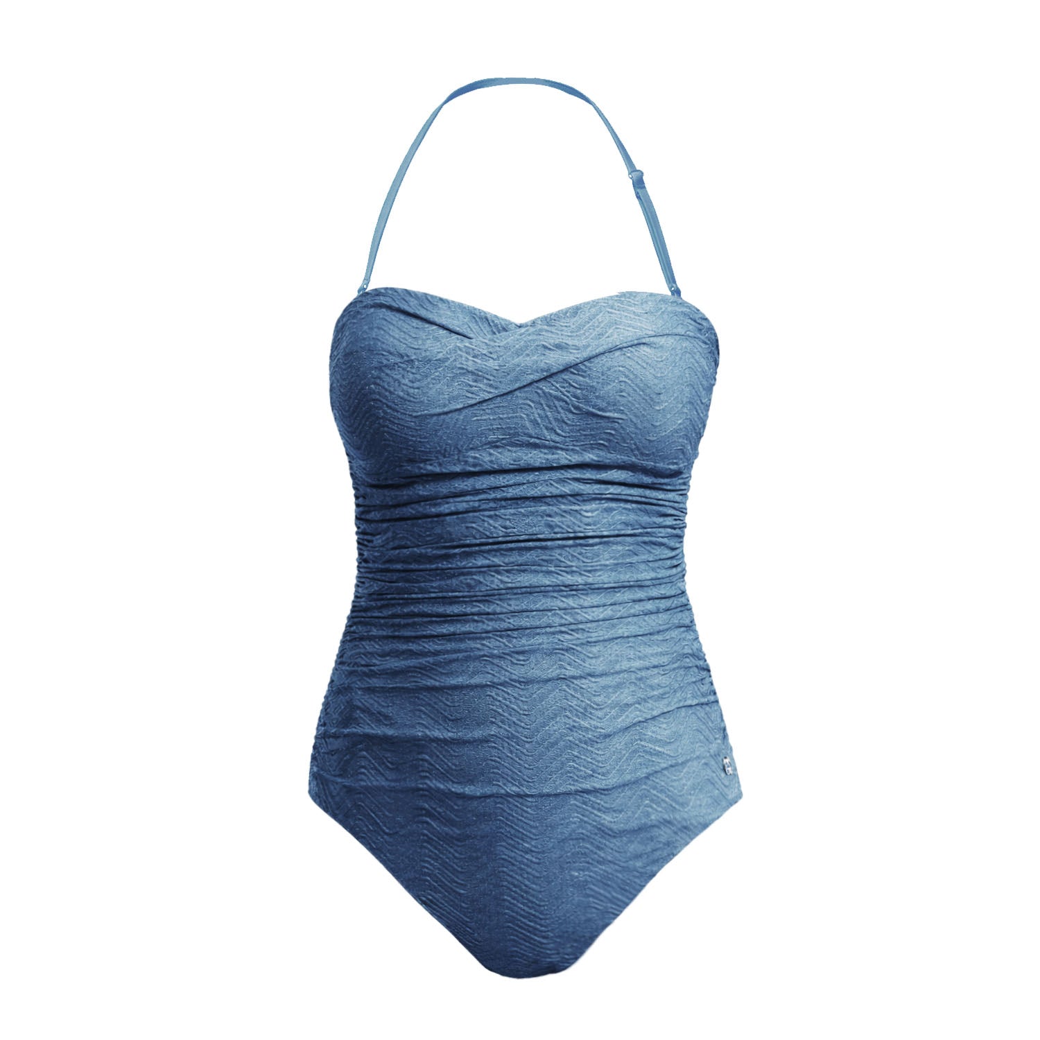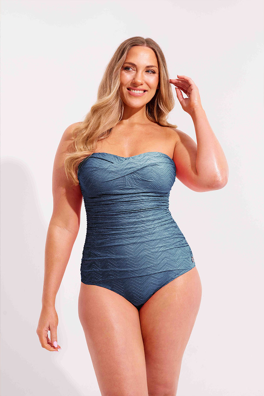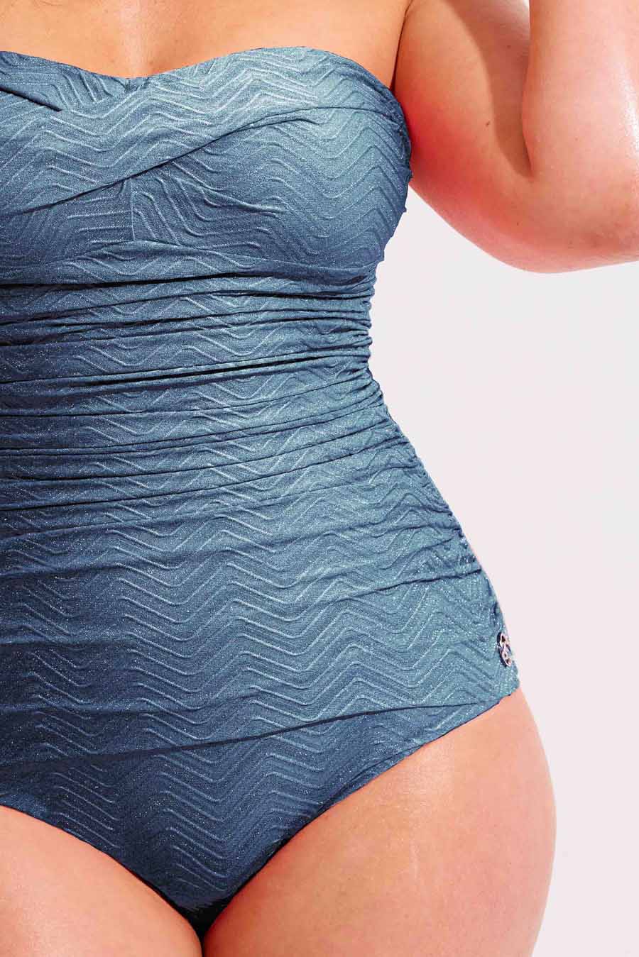 Stand out for all the right reasons in this stunning textured bandeau with a blue and silver-toned gentle shimmer. This refined swimsuit has a gorgeous silver glisten and subtle chevron texture, inspired by the sunset reflecting on the ocean. This classic shape with soft gathering to the front has a removable, adjustable halter strap and stay-put nonslip strip to keep you in place if you remove the strap. This stunning suit has soft fixed bust pads and lots of draping to the tummy area to give you a confidence boost with our famous tummy control technology for gentle firming support. Pair with our Freya dresses for extra holiday glamour.