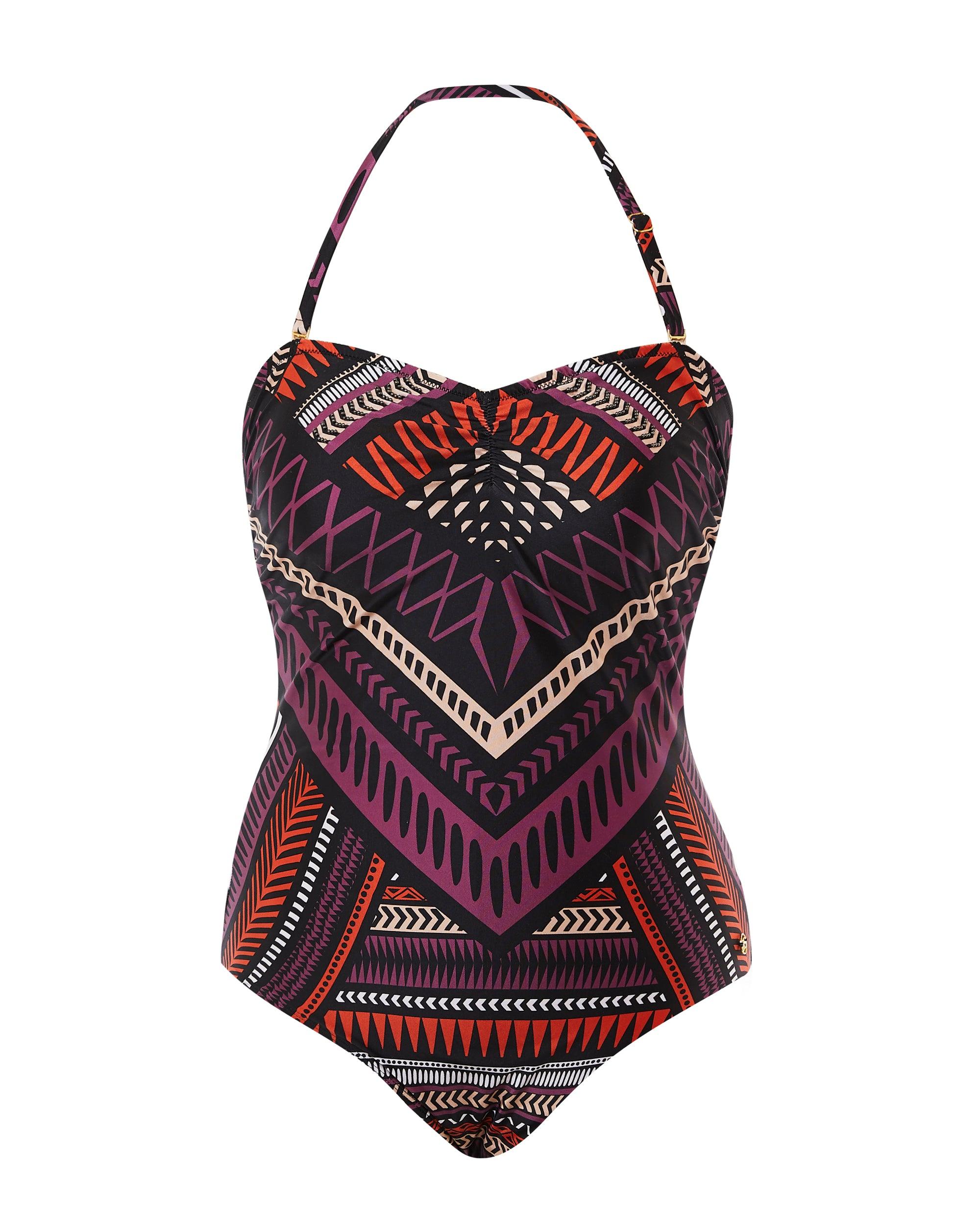 A passionate, Aztec inspired print of contrasting plum purples, styled on a bandeau swimsuit. Featuring adjustable multi-way straps, tummy control power-mesh technology, and gentle ruching around the bust, to ensure total security. Longer length for a more relaxed fit.
