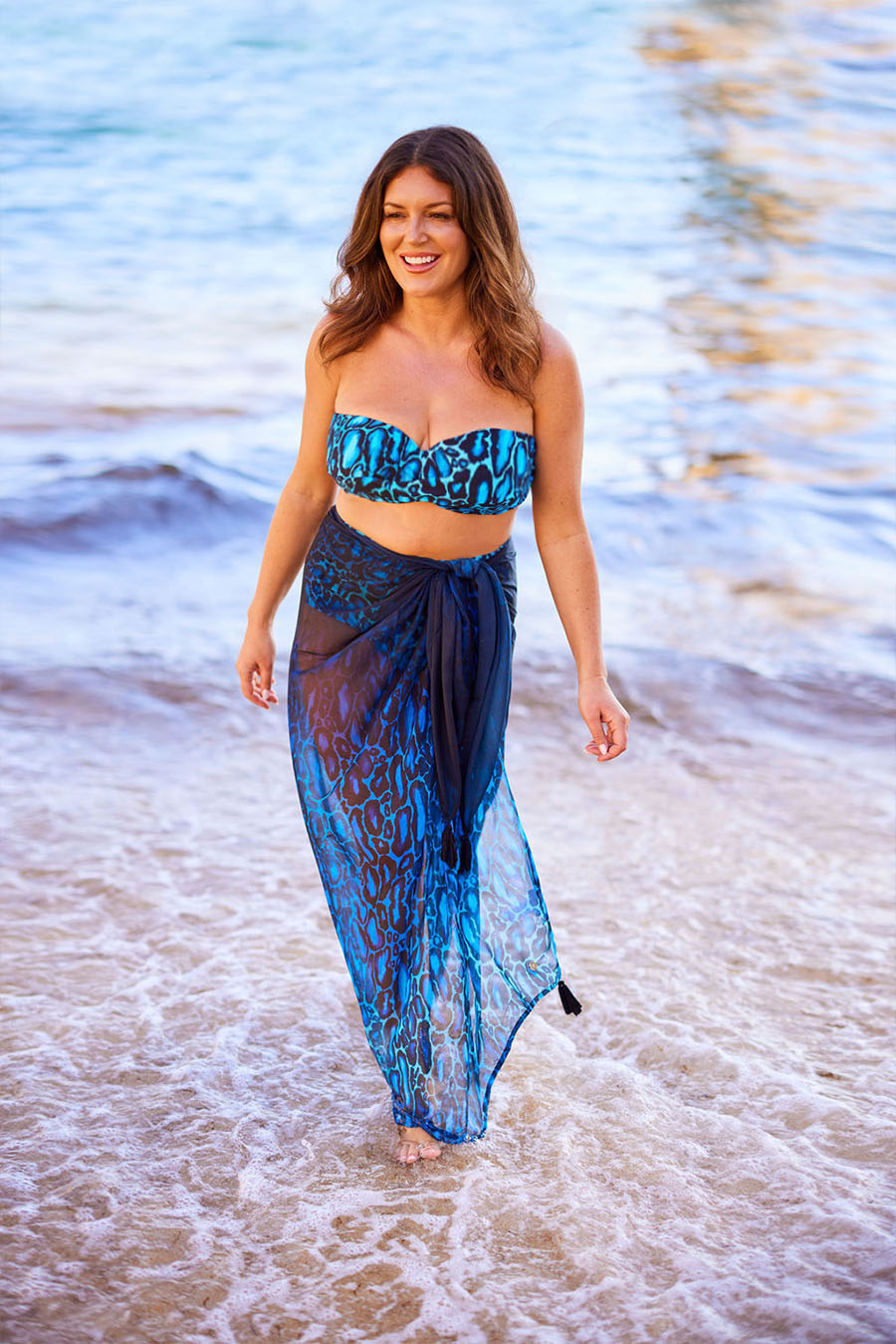 This beautiful blue and black leopard pareo will elevate any summer holiday look. The pareo has chiffon tassel trim detailing and is made with super soft chiffon fabric, the perfect stylish accessory to tie around your waist whilst lounging by the pool or wrap up around you as a dress to go for lunch. Pair with our matching Serengeti gathered bandeau swimsuit or to complete your elegant holiday look.